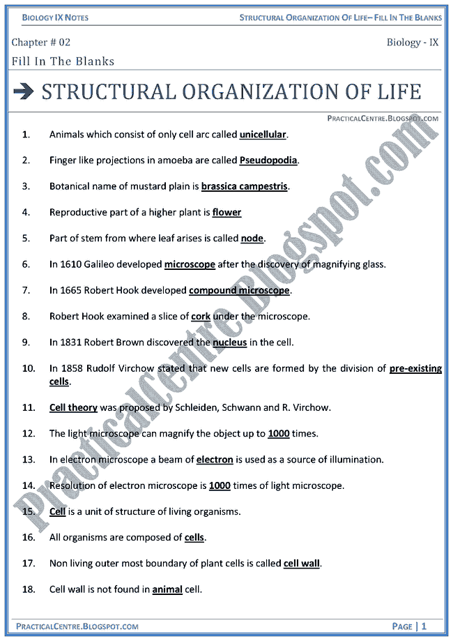 Practical Centre Biology Ninth Class Fill In The Blanks from Structural Organization Of Life